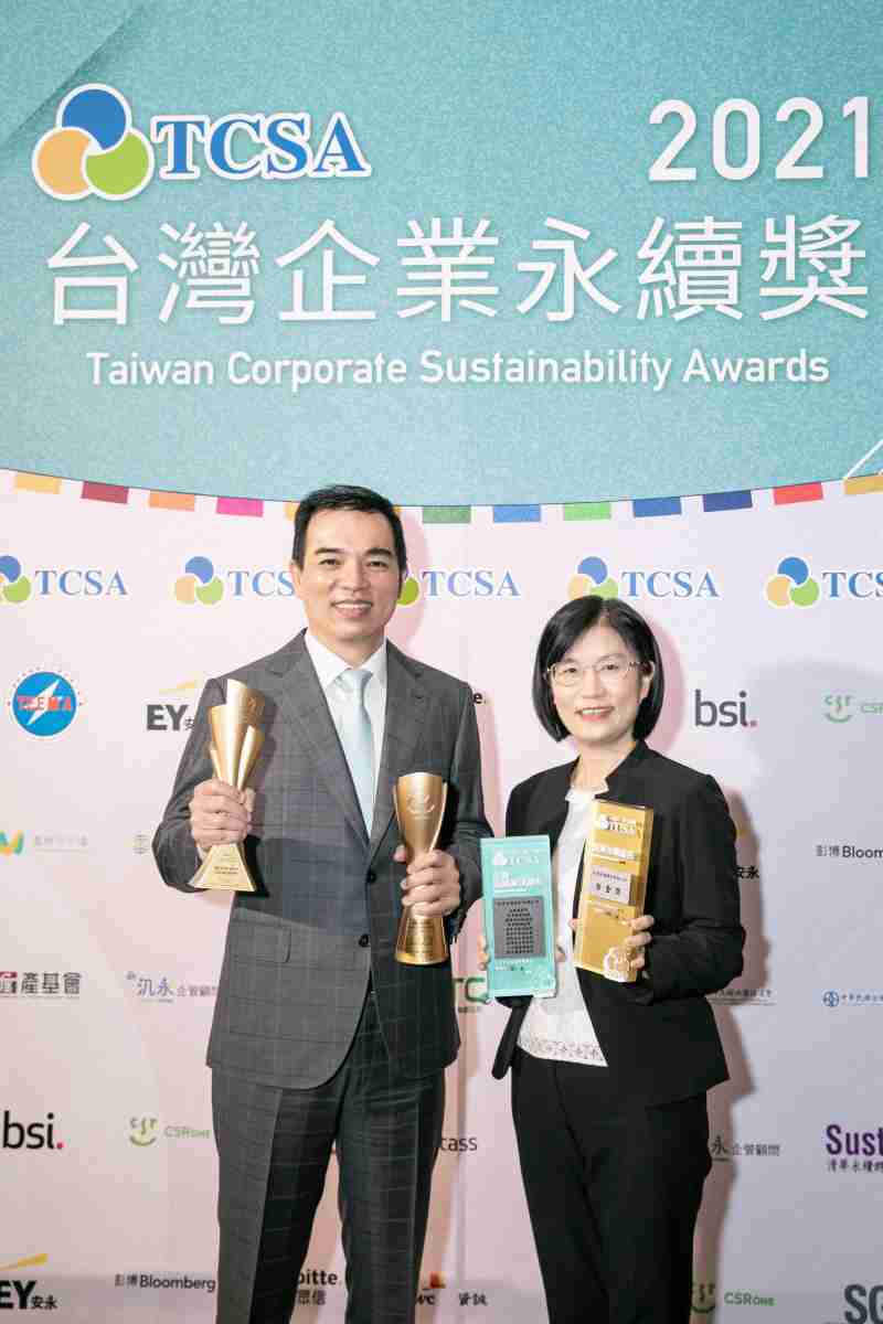 达在台湾永续奖所评比环境、、、社会、、治理等各面向的永续绩效均获高度肯定 (左:尊龙z6光电总经理暨营运长柯富仁,,,,右:尊龙z6光电永续长古秀华)