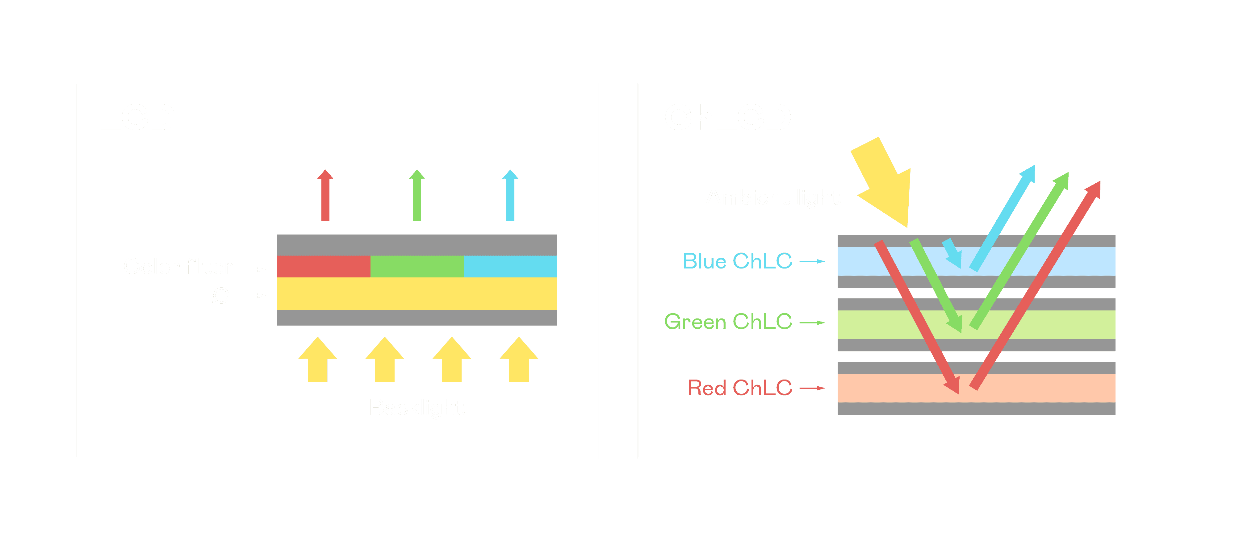 ChLCD 胆固醇液晶就如同纸张一样,,,透过反射环境光来显示影像,,,,因此长时间观看不易造成人眼视觉疲劳,,可达到护眼效果。。。。当处于户外阳光下使用,,LCD 影像容易失真而不易观看,,,但胆固醇液晶仍可维持较佳的影像品质。。