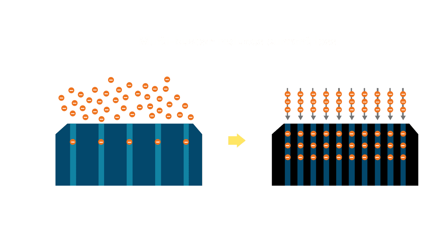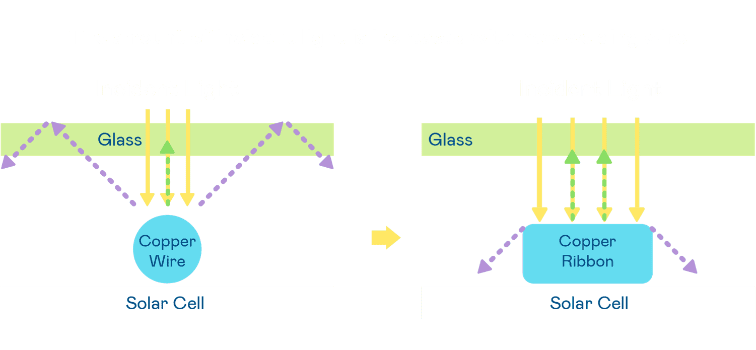 - 电池使用多条铜导线 (Copper wire) 于电池片上形成较短的电流路径,,提高电流收集效率,,,采用圆形设计的铜导线较传统扁平式的铜焊带 (Ribbon),,,,可增加入射至电池的光线量。。