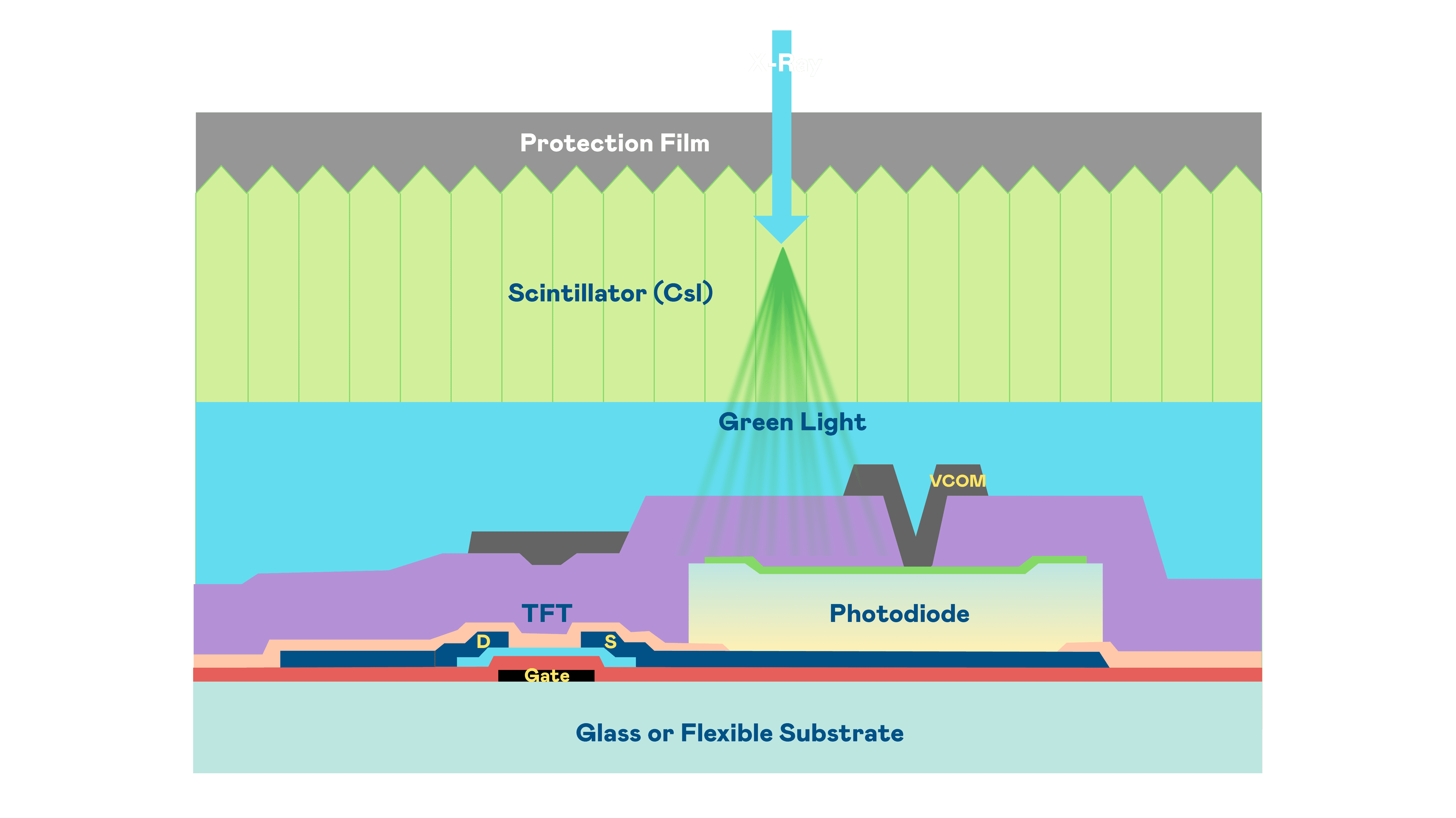 尊龙z6的X光影像感测阵列使用薄膜电晶体 (TFT) 作为每个像素的读取开关,,搭配光电二极体(Photodiode)的光电转换元件,,,用以感测X光影像讯号。。。
